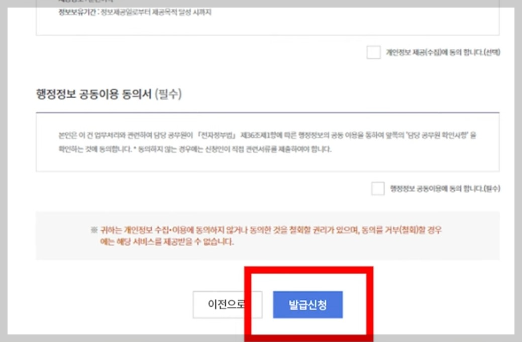 필수체크 후 '발급신청' 버튼을 누릅니다.