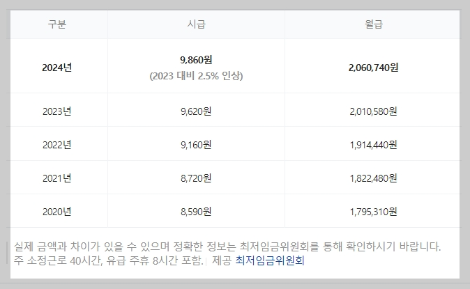 월 최저임금은 약 2,096,270원 입니다.