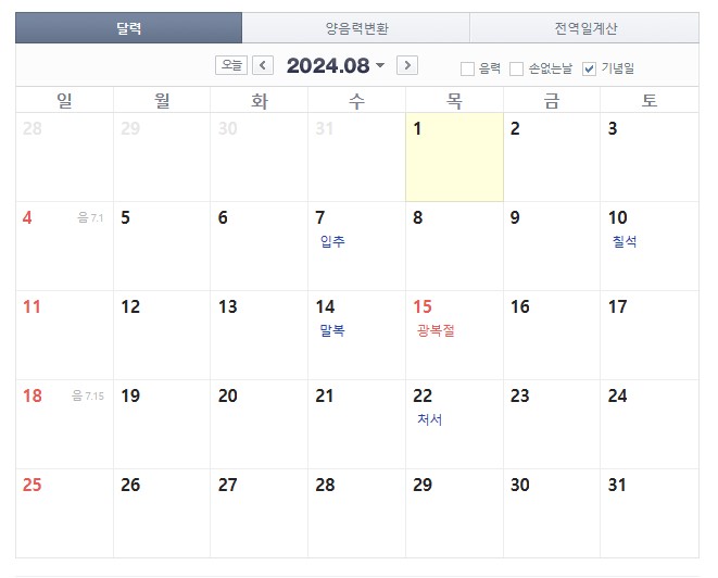 8월 15일 광복절은 목요일에 있습니다.