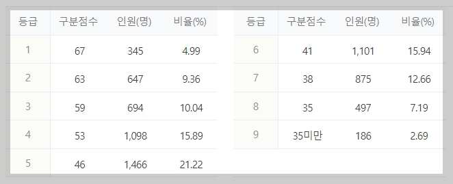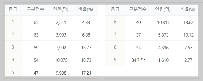 1등급은 131점으로 전체 4.11%, 인원은 총 18,199명이